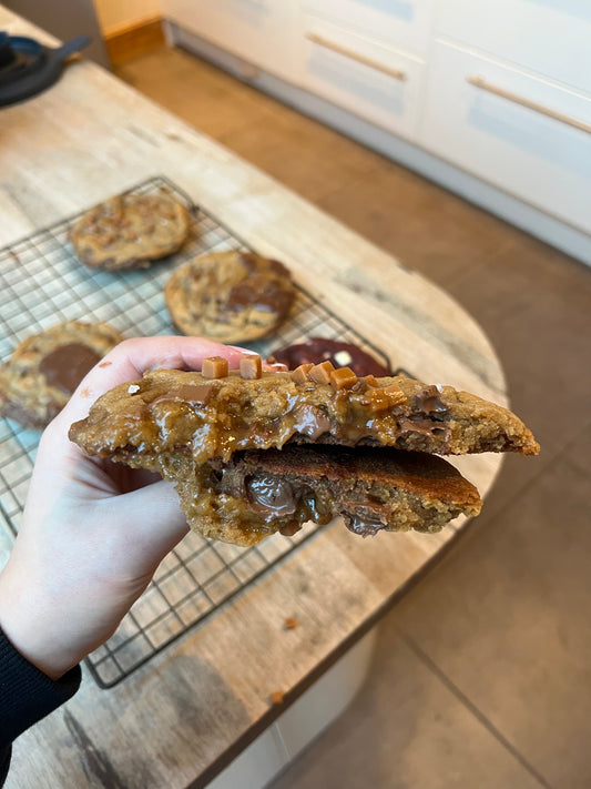 A soft, golden cookie loaded with creamy milk and white chocolate chips, swirled with Biscoff spread and topped with crunchy Biscoff biscuit bits.
